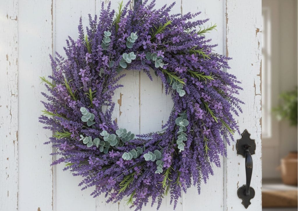 Start with a twig or grapevine base and add soft lavender stems for a natural, rustic vibe. This wreath combines earthy textures with the delicate beauty of lavender. It’s perfect for a cozy, welcoming entryway. Faux lavender ensures it looks fresh and fragrant all season, while the twig base keeps it charming and handmade-looking.