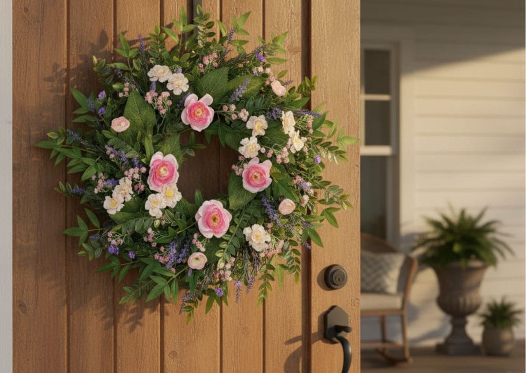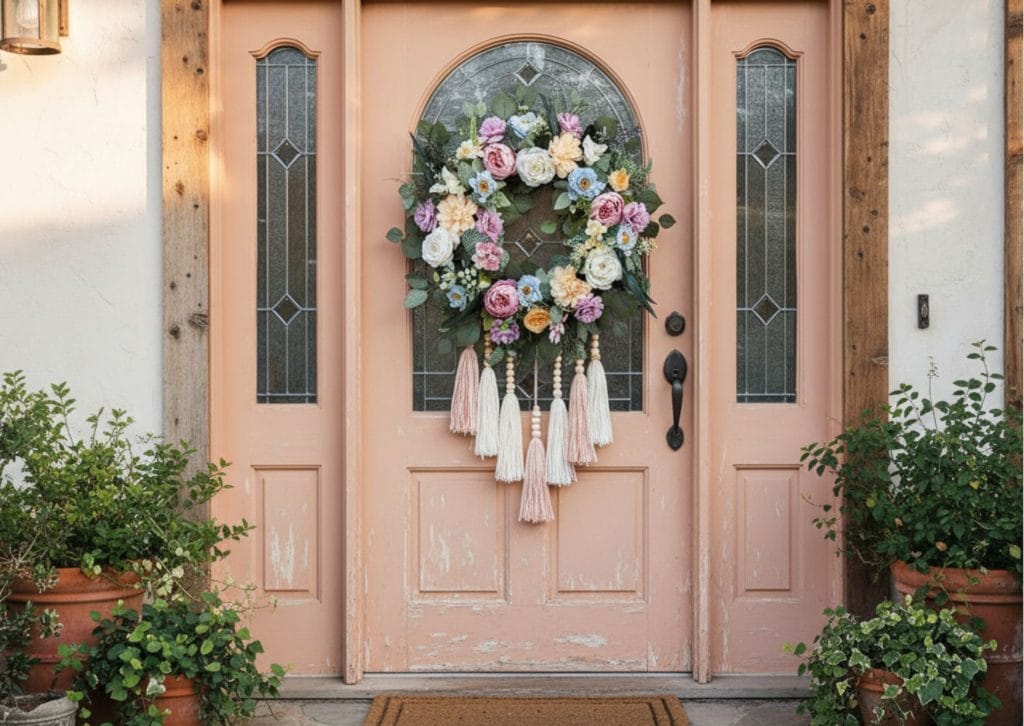 Pastel-colored flowers like pink, lavender, and cream, combined with playful elements like ribbons or tassels, make a creative boho-style wreath. This type of wreath adds personality and fun to your front door. Using faux blooms ensures easy maintenance, keeping the wreath looking bright and stylish all spring.