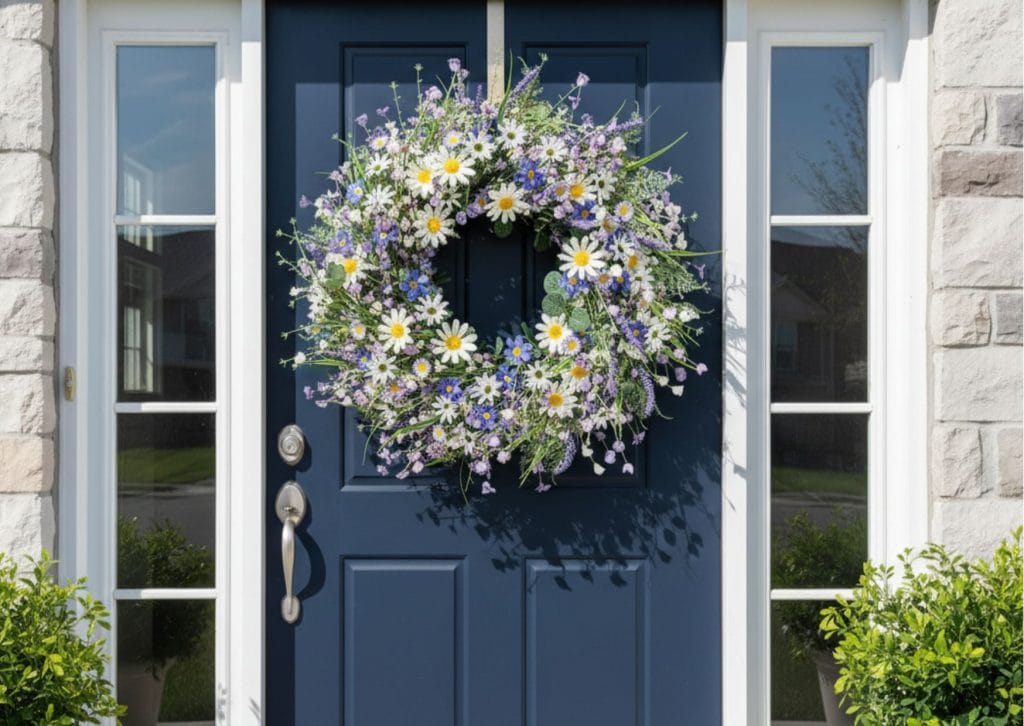 Daisies are simple yet cheerful flowers that instantly brighten up any front door. Pair fresh or high-quality faux daisies with soft greenery like ferns or ivy to give the wreath a full, lively look. This combination creates a clean and refreshing spring vibe. A daisy wreath is perfect if you want a fresh, natural look without being too bold. Using faux daisies ensures the wreath will stay vibrant throughout the season, making it a hassle-free way to decorate.