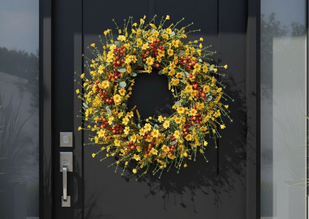 Yellow flowers like daisies, sunflowers, or tulips bring an instant burst of happiness to your entryway. Combine bright yellow blooms with soft greenery for contrast and fullness. This cheerful wreath is perfect for making your home feel warm and inviting the moment guests arrive. Faux flowers help maintain vibrant colors, so your front door keeps shining throughout spring.