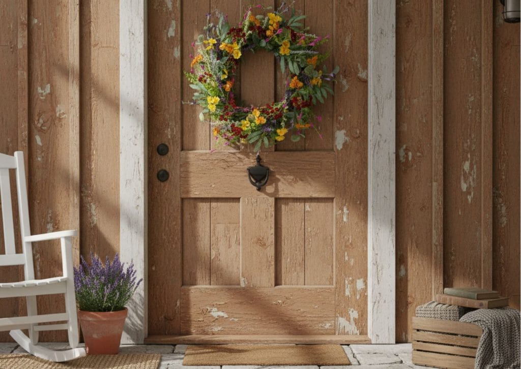 Boho-style wreaths are all about playful colors and textures. Use pastel flowers like blush pink roses, lavender, and soft blue hydrangeas, and add fun elements like ribbons or tiny tassels. This wreath gives a creative, artistic look to your entryway. It’s perfect for anyone who loves unique, colorful decor and wants their front door to feel lively and personalized. Faux blooms make it easy to maintain and keep looking beautiful all season.