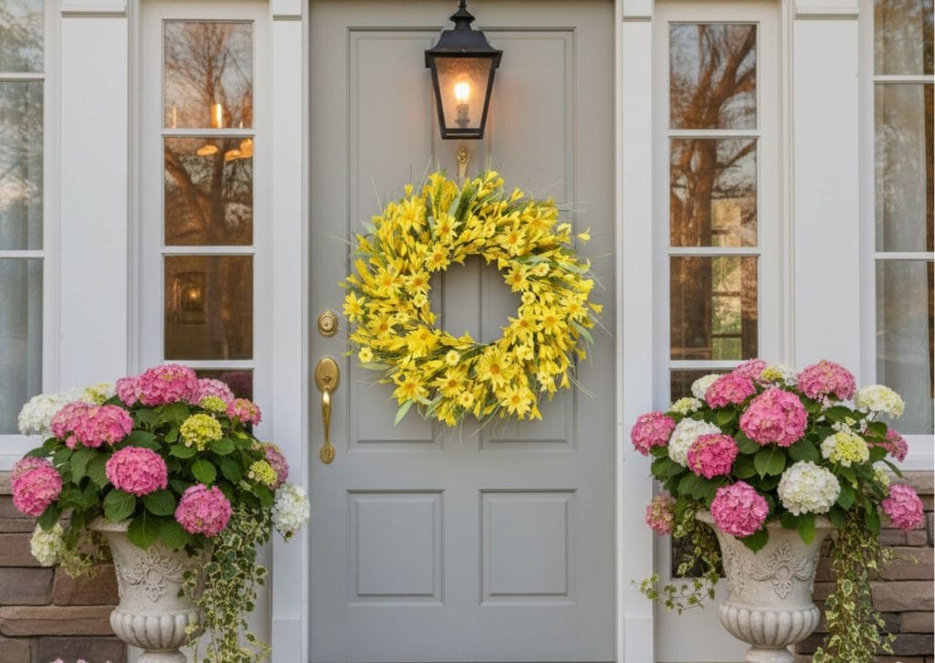 Hydrangeas are soft, full blooms that give a wreath a lush and elegant look. Combine pastel-colored hydrangeas with fresh green leaves for depth and texture. This wreath is perfect for anyone who loves a subtle, classy spring decoration. Using high-quality faux hydrangeas ensures it stays vibrant all season, giving your front door a beautiful, welcoming appearance.