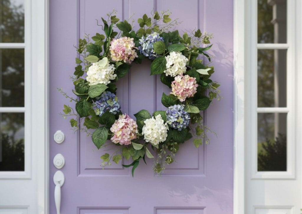 Soft pastel hydrangeas in pink, blue, or lavender give a wreath a dreamy, elegant look. Mixing in light green leaves creates depth and dimension. This wreath is perfect for anyone who loves a subtle yet beautiful spring decoration. Using faux hydrangeas ensures the colors stay fresh, making it an easy, low-maintenance option that looks professionally crafted.