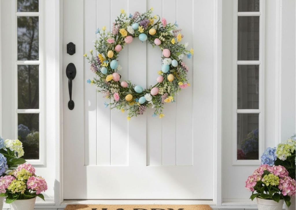 Celebrate spring with a wreath that includes tiny decorative eggs mixed with seasonal flowers like tulips or daffodils. This style is cheerful, festive, and perfect for adding seasonal charm to your door. Use faux flowers and eggs for longevity and easy maintenance. This wreath works well for families or anyone who loves whimsical, fun spring decor that’s inviting for guests.