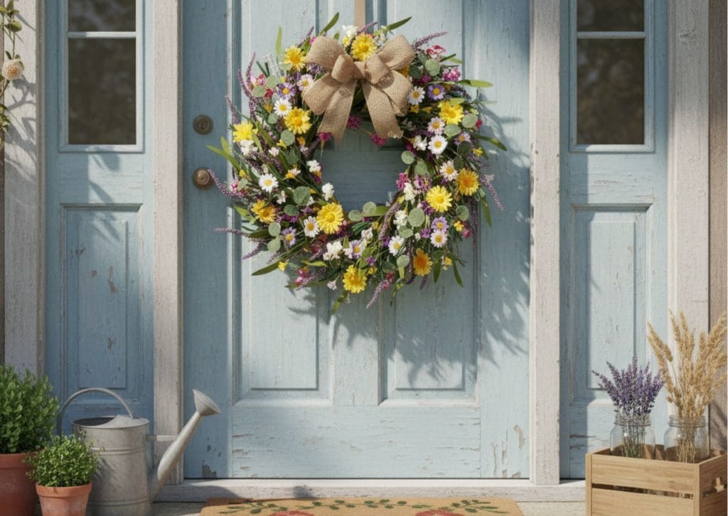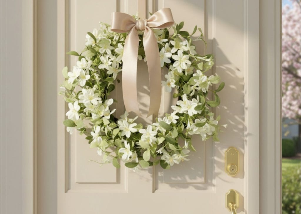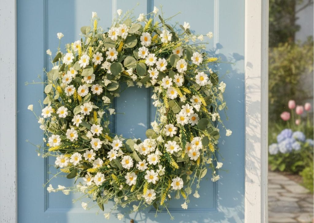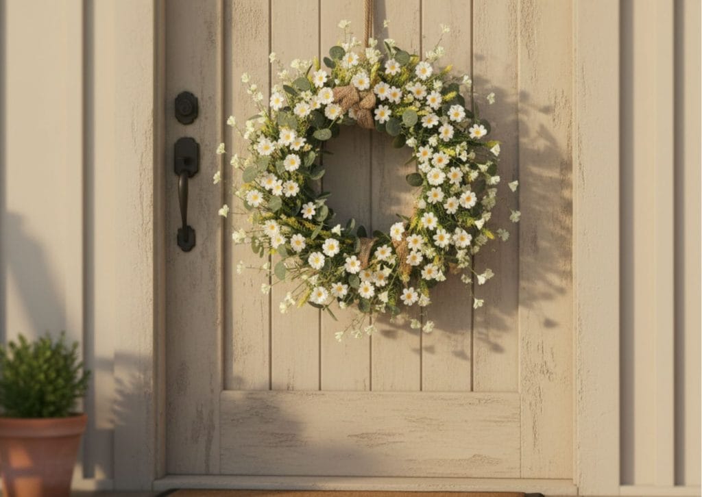A simple greenery wreath with a few flowers or a pastel daisy wreath is perfect for beginners. Using a pre-made wreath base from Amazon or craft stores makes it even easier to create a polished look without spending hours.