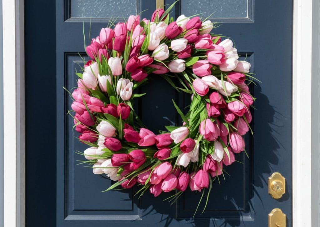 Combine soft pastel tulips with tiny decorative butterflies for a whimsical, springtime feel. The butterflies add a playful, charming element, while the tulips provide fresh, vibrant colors. This wreath is ideal for families or anyone who wants a fun, lively decoration at their door. Using faux flowers and butterflies ensures long-lasting beauty without any fuss.