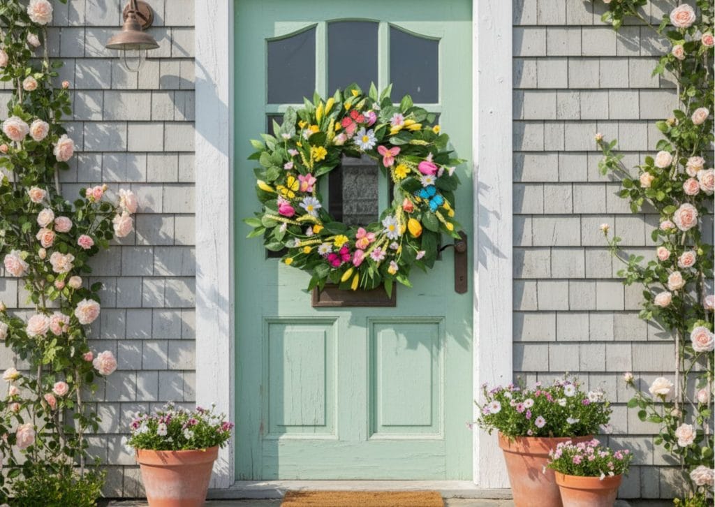 Add a whimsical touch with small butterfly decorations on a simple floral wreath. Soft pastel flowers paired with tiny butterflies instantly create a playful, springtime look. This wreath works beautifully for people who love unique and creative touches on their front door. You can use artificial butterflies that stay colorful and realistic, giving your entryway a magical and welcoming feel all season long.