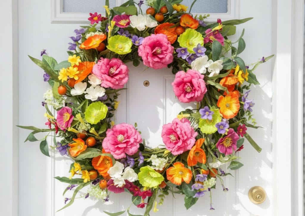 Mix bold colors like pinks, yellows, and oranges for a lively spring display. Incorporate flowers like tulips, daisies, and ranunculus for a cheerful look. This wreath is ideal for those who love vibrant, attention-grabbing decor. Faux flowers ensure the wreath stays colorful and welcoming throughout the season.