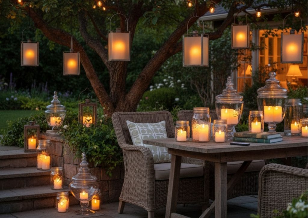 Add a touch of whimsy by hanging LED candles in lanterns above your tables or lounge areas. It creates a soft, dreamy glow that fills the space beautifully. Plus, it’s a simple, safe way to add vertical lighting without worrying about open flames or dripping wax.